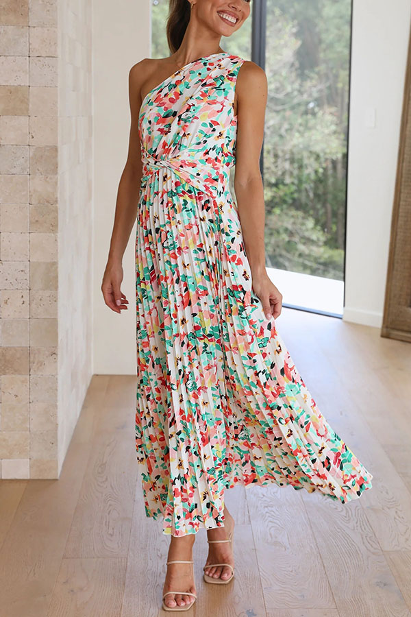 Saw An Angel Floral One Shoulder Elastic Waist Pleated Maxi Dress